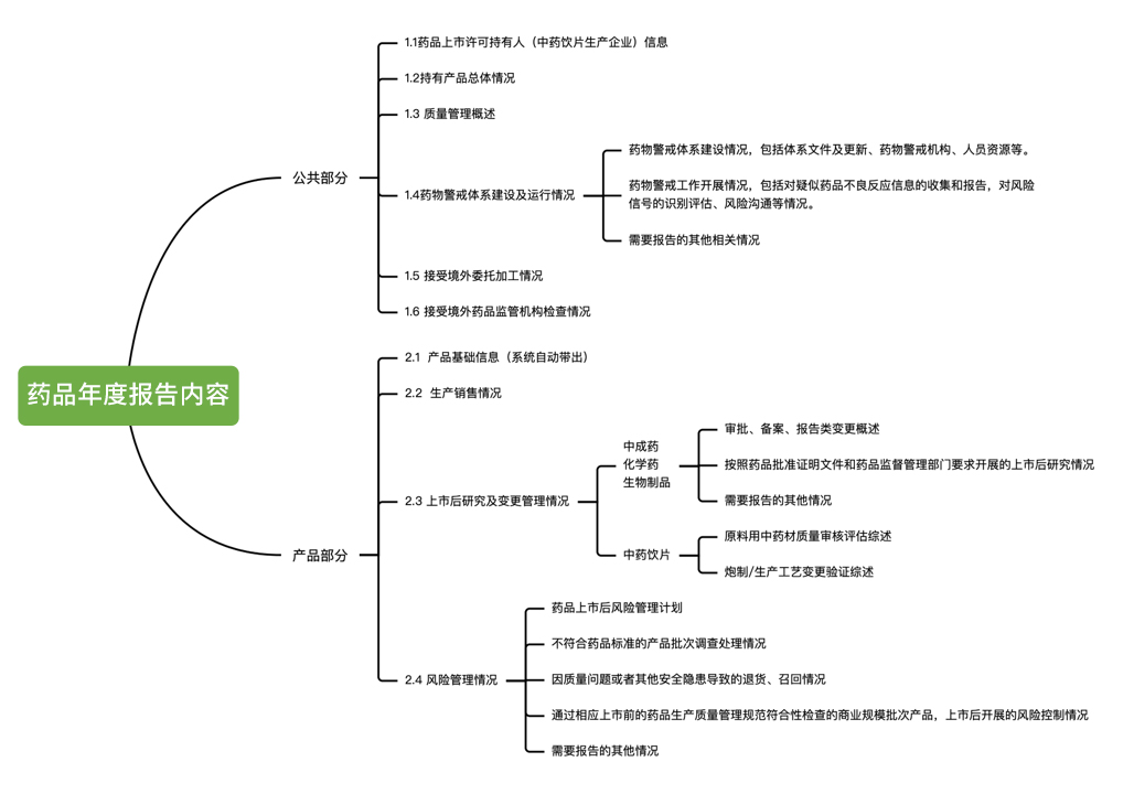 藥物警戒年度報告主要分為10部分,包括持有人信息、藥品信息、藥物警戒體系、各例藥品不良反應(yīng)報告、定期分析評估、風(fēng)險評估和控制、上市后安全性研究、藥物警戒工作自評、其他說明及附件列表。