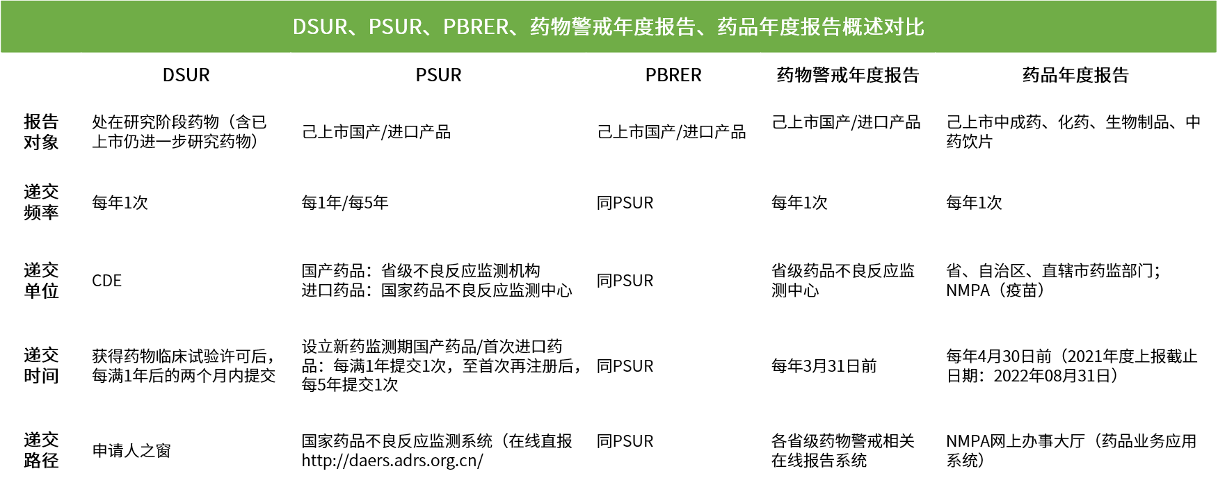 藥品上市后報告主要分為四類,定期安全性更新報告(PSUR)、定期獲益-風(fēng)險評估報告(PBRER)、藥物警戒年度報告和藥品年度報告。