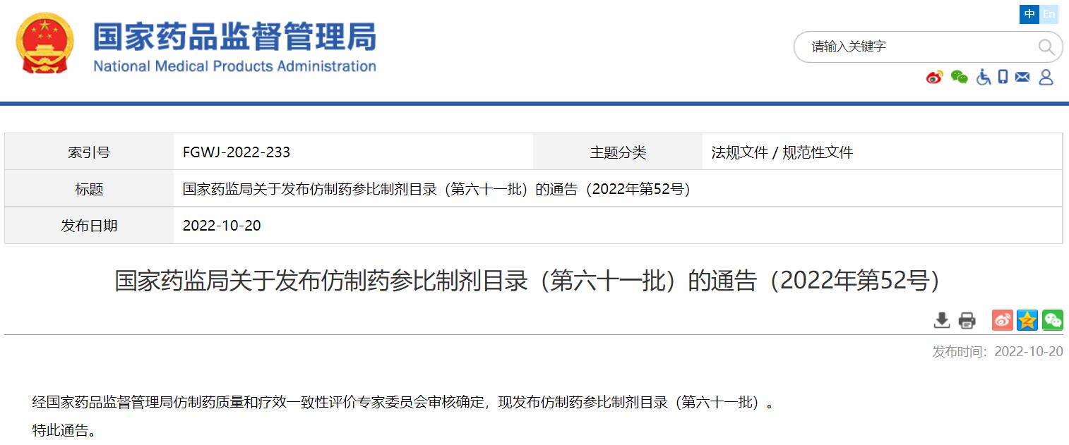國家藥監(jiān)局關(guān)于發(fā)布仿制藥參比制劑目錄(第六十一批)的通告(2022年第52號(hào))
