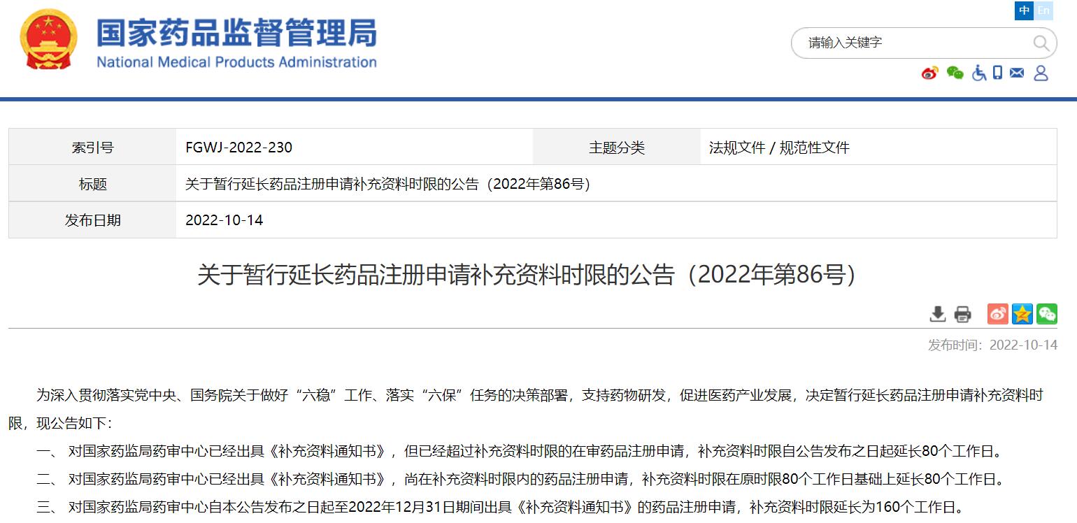 關(guān)于暫行延長藥品注冊(cè)申請(qǐng)補(bǔ)充資料時(shí)限的公告(2022年第86號(hào))