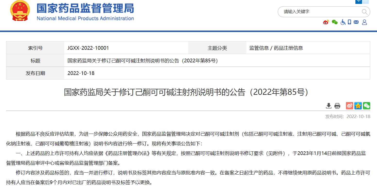 國家藥監(jiān)局關(guān)于修訂己酮可可堿注射劑說明書的公告(2022年第85號(hào))