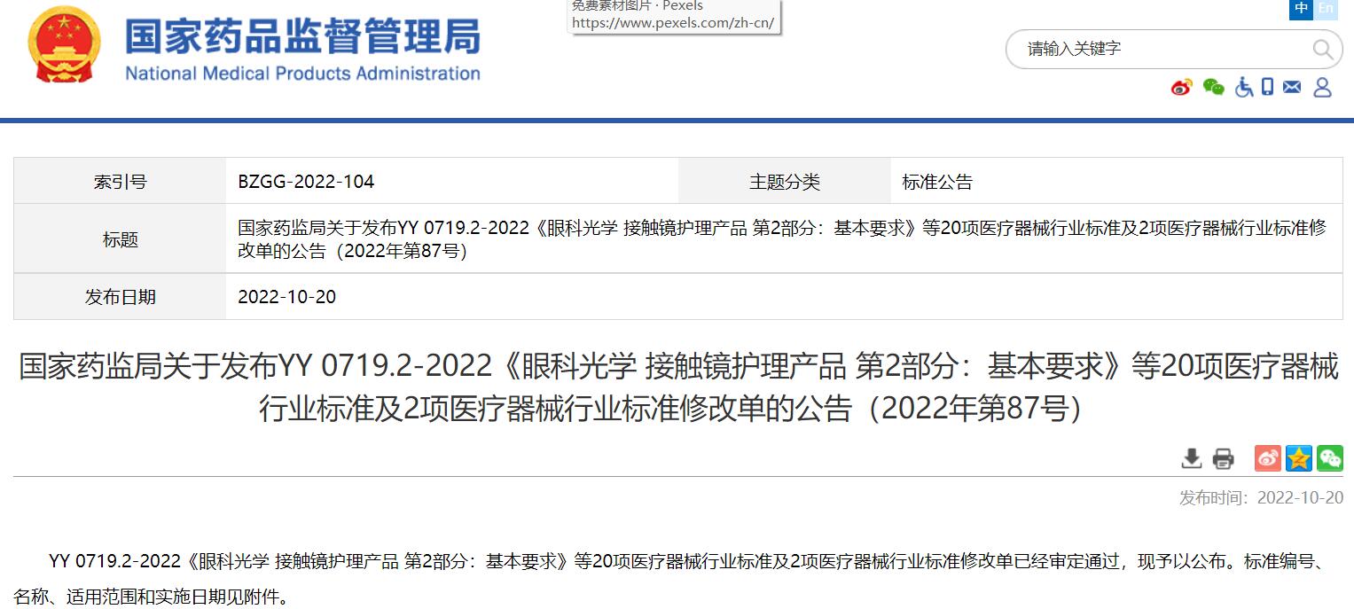國家藥監(jiān)局關(guān)于發(fā)布YY 0719.2-2022《眼科光學(xué)接觸鏡護(hù)理產(chǎn)品第2部分:基本要求》等20項(xiàng)醫(yī)療器械行業(yè)標(biāo)準(zhǔn)及2項(xiàng)醫(yī)療器械行業(yè)標(biāo)準(zhǔn)修改單的公告(2022年第87號(hào))