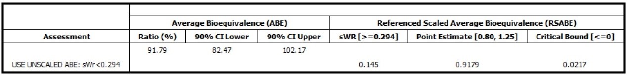 結(jié)論:本試驗(yàn)為3周期設(shè)計(jì),但因未能滿足sWR≥0.294,故無(wú)法采用RSABE算法,只能按照ABE算法計(jì)算90%置信區(qū)間,但計(jì)算結(jié)果表明Cmax的90%置信區(qū)間下限偏低(74.72%<80.00%),故本次試驗(yàn)失敗,需重新擬定項(xiàng)目后續(xù)方案。