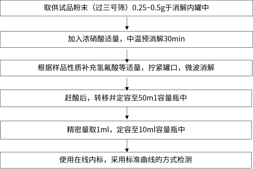 案例二:新領(lǐng)先醫(yī)藥分析測試中心使用電感耦合等離子體質(zhì)譜儀(ICP-MS)進行了中藥材中的鉛、鎘、砷、汞、銅等元素的的檢測。ICP-MS元素檢測的前處理方法流程如下: