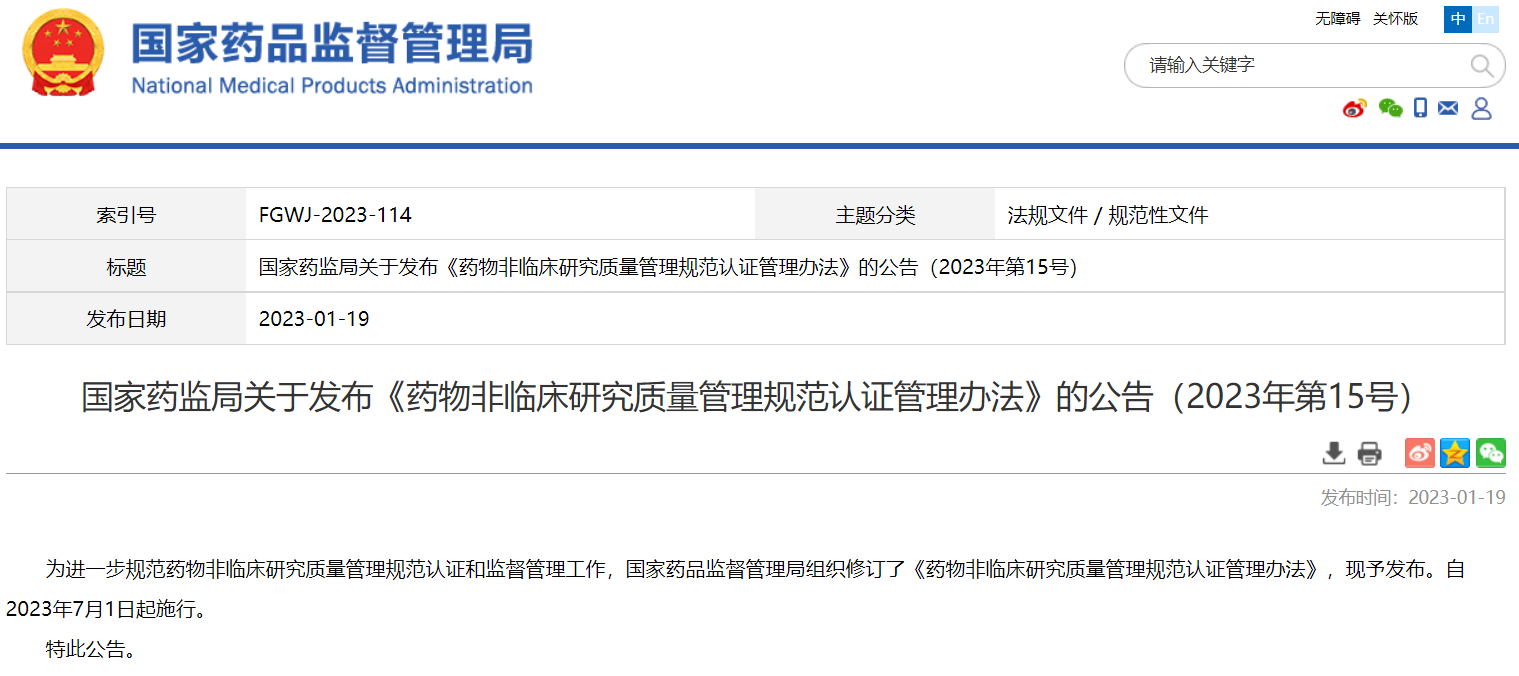 國(guó)家藥監(jiān)局關(guān)于發(fā)布《藥物非臨床研究質(zhì)量管理規(guī)范認(rèn)證管理辦法》的公告(2023年第15號(hào))