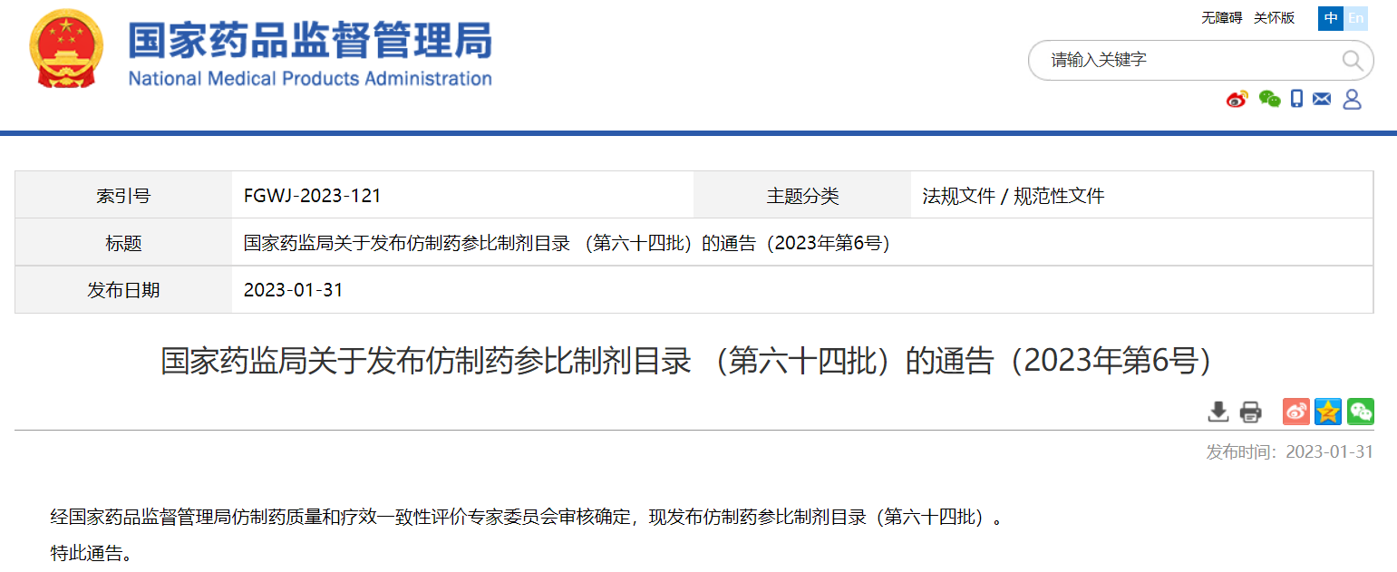 國(guó)家藥監(jiān)局關(guān)于發(fā)布仿制藥參比制劑目錄 (第六十四批)的通告(2023年第6號(hào))