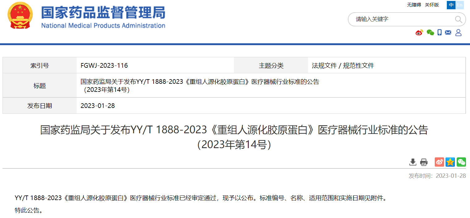 國(guó)家藥監(jiān)局關(guān)于發(fā)布YY/T 1888-2023《重組人源化膠原蛋白》醫(yī)療器械行業(yè)標(biāo)準(zhǔn)的公告 (2023年第14號(hào))