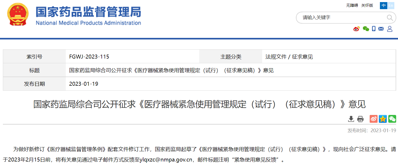 國(guó)家藥監(jiān)局綜合司公開(kāi)征求《醫(yī)療器械緊急使用管理規(guī)定(試行)(征求意見(jiàn)稿)》意見(jiàn)