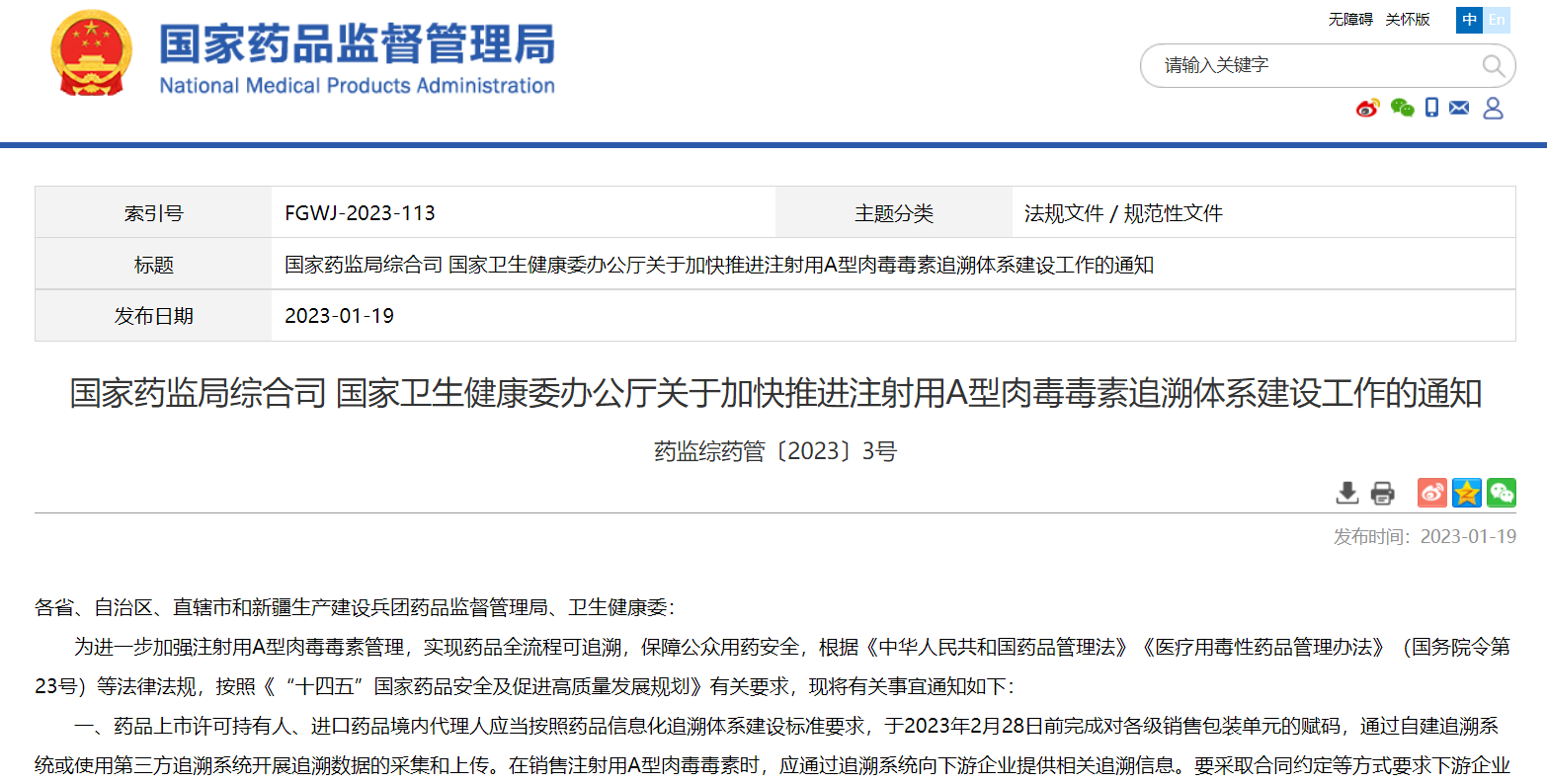 國(guó)家藥監(jiān)局綜合司 國(guó)家衛(wèi)生健康委辦公廳關(guān)于加快推進(jìn)注射用A型肉毒毒素追溯體系建設(shè)工作的通知