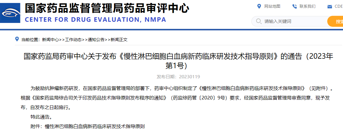 國(guó)家藥監(jiān)局藥審中心關(guān)于發(fā)布《慢性淋巴細(xì)胞白血病新藥臨床研發(fā)技術(shù)指導(dǎo)原則》的通告(2023年第1號(hào))