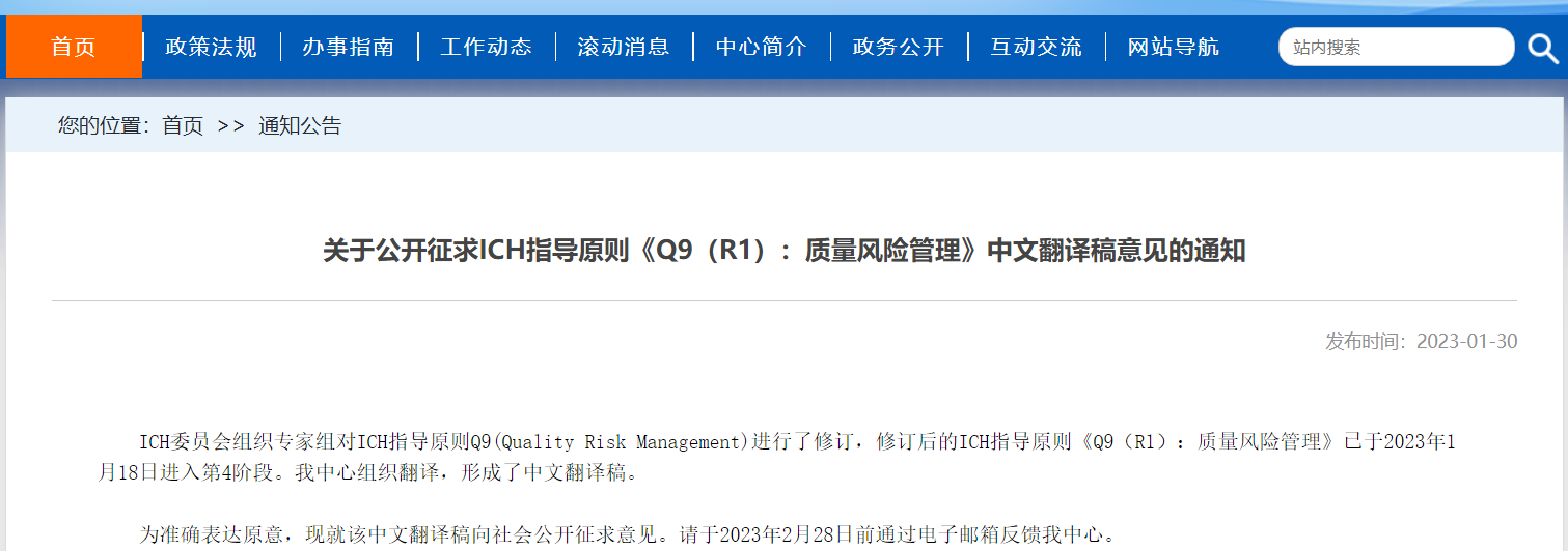 關(guān)于公開(kāi)征求ICH指導(dǎo)原則《Q9(R1):質(zhì)量風(fēng)險(xiǎn)管理》中文翻譯稿意見(jiàn)的通知