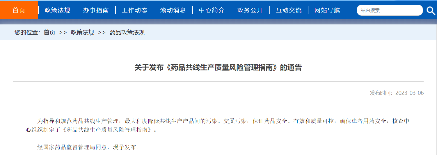 國家藥監(jiān)局核查中心關(guān)于發(fā)布《藥品共線生產(chǎn)質(zhì)量風(fēng)險管理指南》的通告