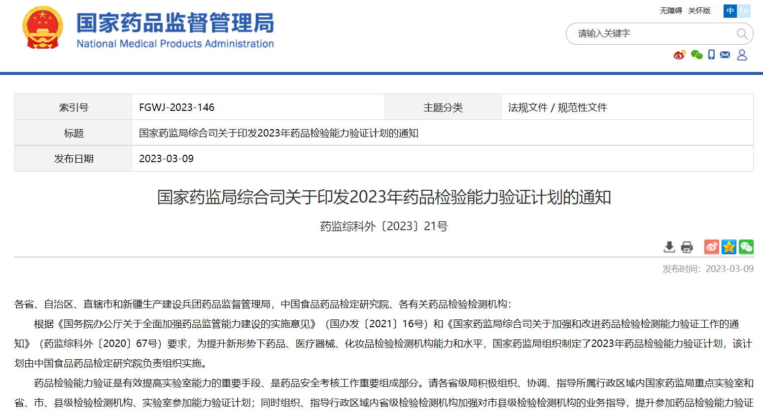 國家藥監(jiān)局綜合司關(guān)于印發(fā)2023年藥品檢驗(yàn)?zāi)芰︱?yàn)證計劃的通知