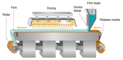 溶劑澆鑄法:溶劑澆鑄法是最常被運(yùn)用的制備技術(shù),其工藝過(guò)程簡(jiǎn)單概況而言就是將成膜材料、原料藥和其他輔料溶解或懸浮在適宜的溶劑中,如水、乙醇、丙酮等;混合均勻后去除氣泡,然后澆鑄到模具上或涂布成膜劑,干燥后進(jìn)行切割和包裝。