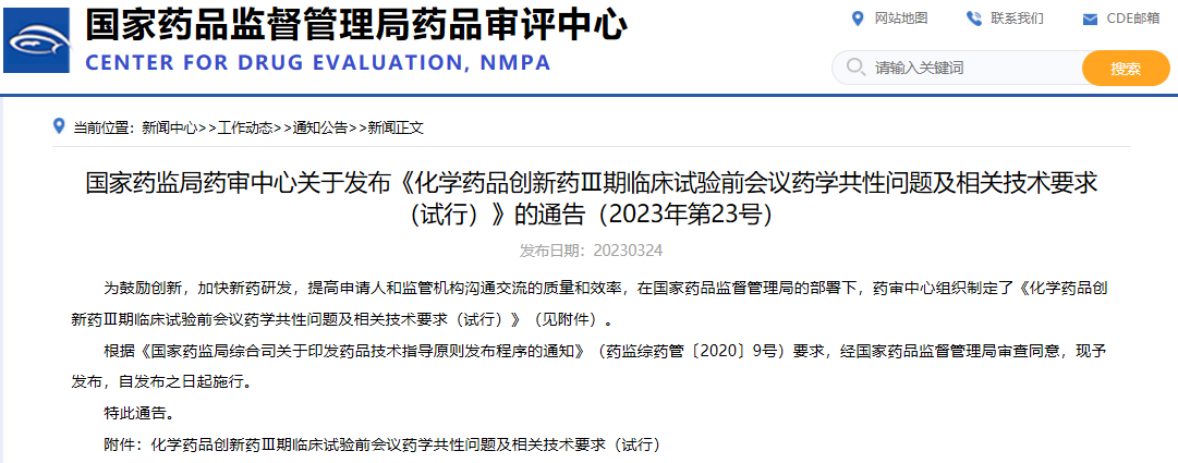 國家藥監(jiān)局藥審中心關(guān)于發(fā)布《化學(xué)藥品創(chuàng)新藥Ⅲ期臨床試驗(yàn)前會議藥學(xué)共性問題及相關(guān)技術(shù)要求(試行)》的通告(2023年第23號)