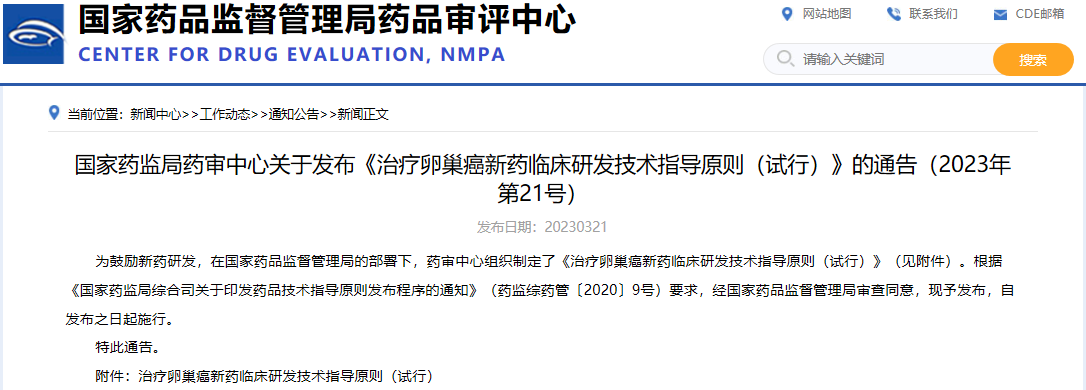 國家藥監(jiān)局藥審中心關(guān)于發(fā)布《治療卵巢癌新藥臨床研發(fā)技術(shù)指導(dǎo)原則(試行)》的通告(2023年第21號)