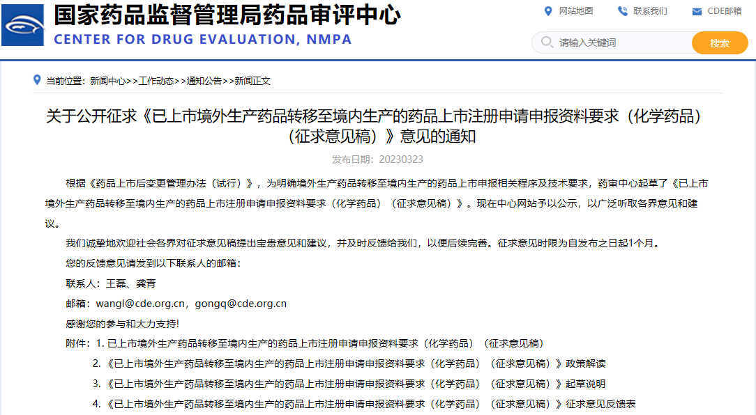 關(guān)于公開征求《已上市境外生產(chǎn)藥品轉(zhuǎn)移至境內(nèi)生產(chǎn)的藥品上市注冊申請申報(bào)資料要求(化學(xué)藥品)(征求意見稿)》意見的通知