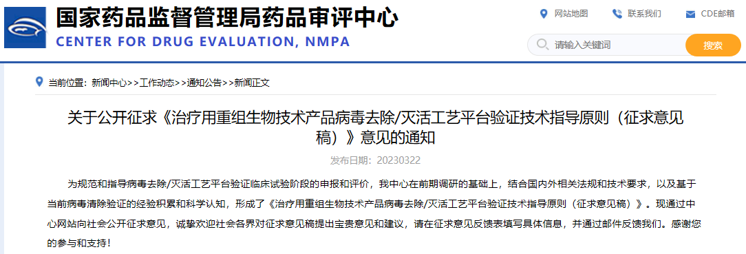 關(guān)于公開征求《治療用重組生物技術(shù)產(chǎn)品病毒去除/滅活工藝平臺驗(yàn)證技術(shù)指導(dǎo)原則(征求意見稿)》意見的通知