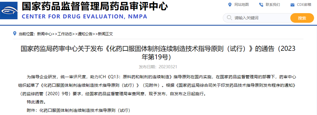 國家藥監(jiān)局藥審中心關(guān)于發(fā)布《化藥口服固體制劑連續(xù)制造技術(shù)指導(dǎo)原則(試行)》的通告(2023年第19號)