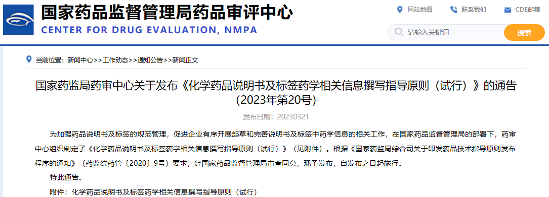 國家藥監(jiān)局藥審中心關(guān)于發(fā)布《化學(xué)藥品說明書及標(biāo)簽藥學(xué)相關(guān)信息撰寫指導(dǎo)原則(試行)》的通告(2023年第20號)