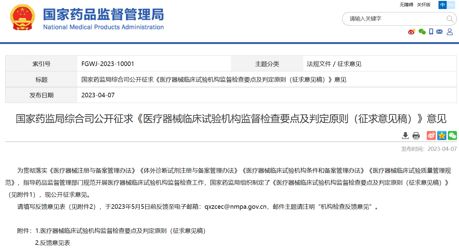國家藥監(jiān)局綜合司公開征求《醫(yī)療器械臨床試驗機構監(jiān)督檢查要點及判定原則(征求意見稿)》意見