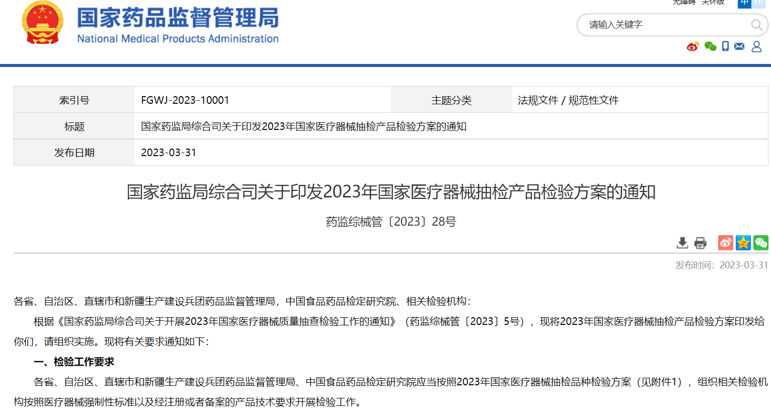 國家藥監(jiān)局綜合司關于印發(fā)2023年國家醫(yī)療器械抽檢產(chǎn)品檢驗方案的通知