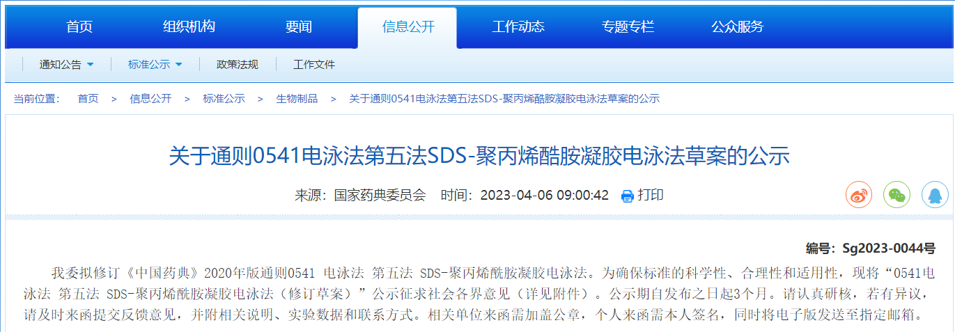 關于通則0541電泳法第五法SDS-聚丙烯酷胺凝膠電泳法草案的公示