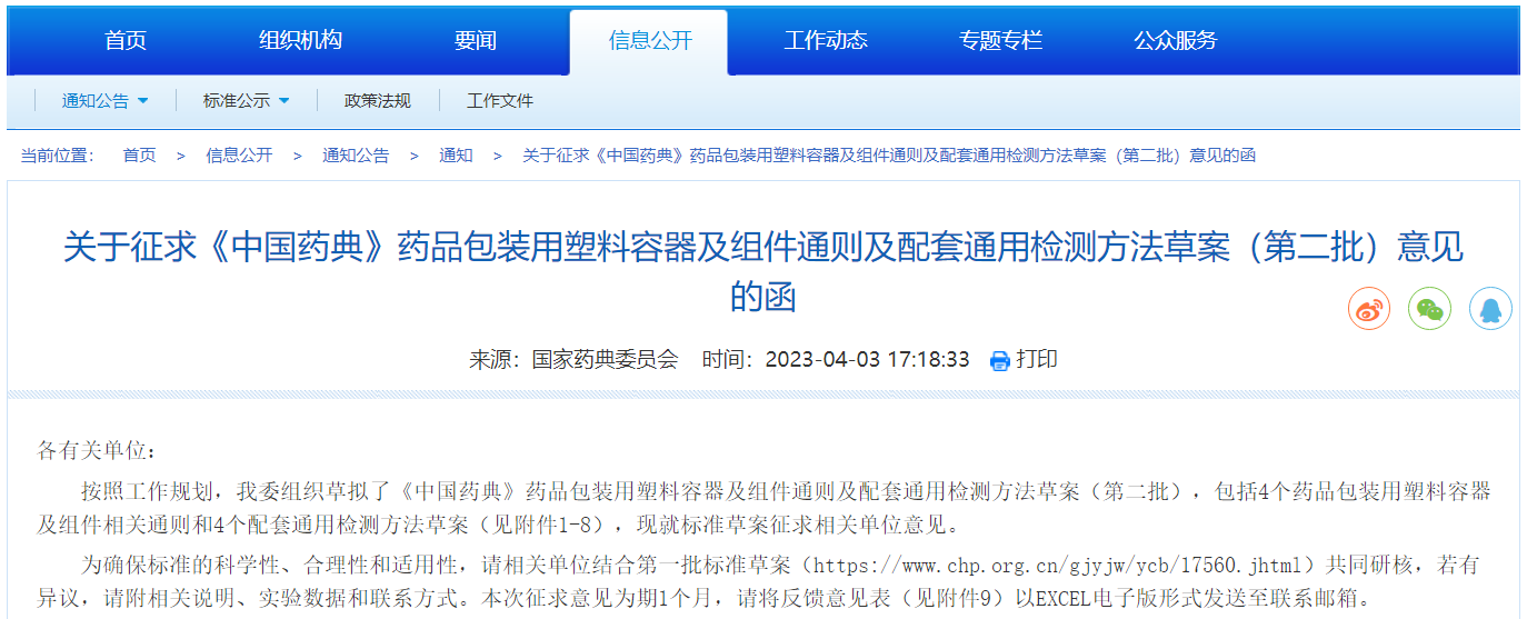 關于征求《中國藥典》藥品包裝用塑料容器及組件通則及配套通用檢測方法草案(第二批)意見的函