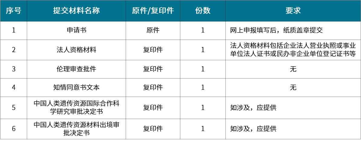 材料出境審批:利用中國人類遺傳資源開展國際合作科學研究,或者因其他特殊情況確需將中國人類遺傳資源材料運送郵寄、攜帶出境