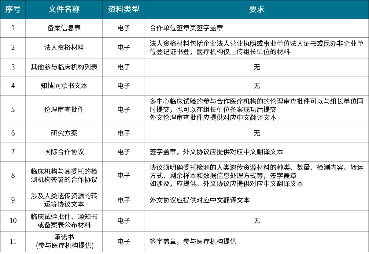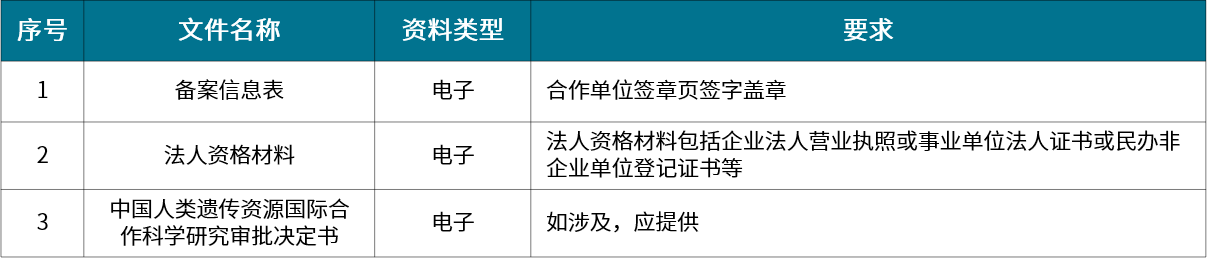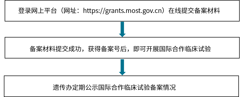 國際合作臨床試驗備案:為獲得相關藥品和醫(yī)療器械在我國上市許可,在臨床機構(gòu)利用我國人類遺傳資源開展國際合作臨床試驗、不涉及人類遺傳資源材料出境