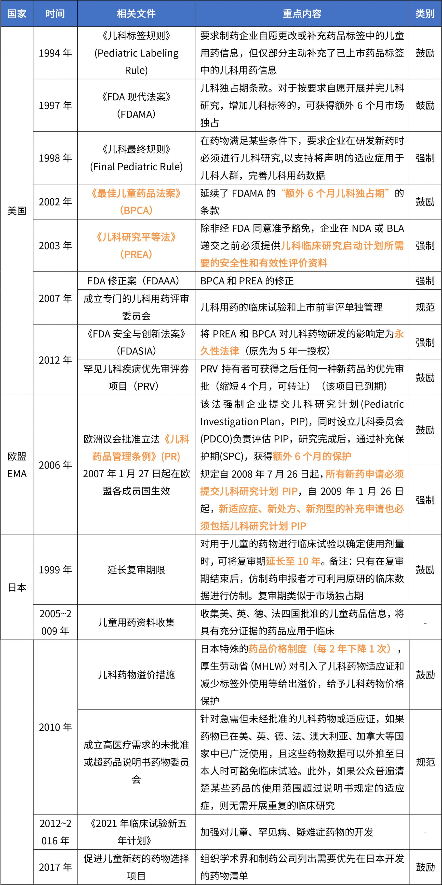 歐美日是兒科用藥政策先行者,美國(guó)、歐盟都具有專門的的兒童用藥立法,采用鼓勵(lì)+強(qiáng)制結(jié)合的協(xié)同策略促進(jìn)兒童新藥的開發(fā)、兒童臨床試驗(yàn)的管理等。日本也通過(guò)制定各種法規(guī)來(lái)鼓勵(lì)規(guī)兒藥開發(fā)。各國(guó)項(xiàng)目?jī)核幏ㄒ?guī)內(nèi)容見下表。