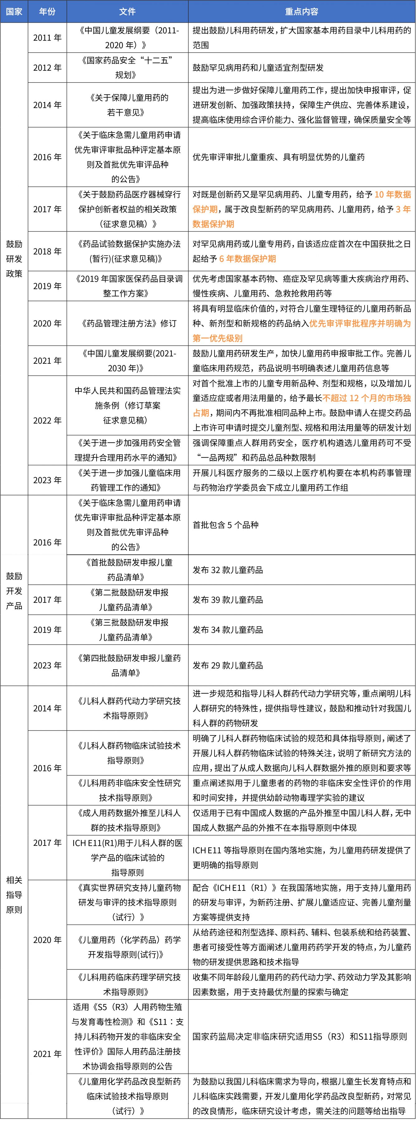 在我國(guó),為鼓勵(lì)國(guó)內(nèi)藥企加大兒童藥的研發(fā)和生產(chǎn),近年來(lái),政府部門陸續(xù)出臺(tái)了一系列相關(guān)政策,包括鼓勵(lì)研發(fā)、優(yōu)先評(píng)審、加強(qiáng)醫(yī)院配備、招標(biāo)采購(gòu)直接掛網(wǎng)等,部分法規(guī)詳見下表。