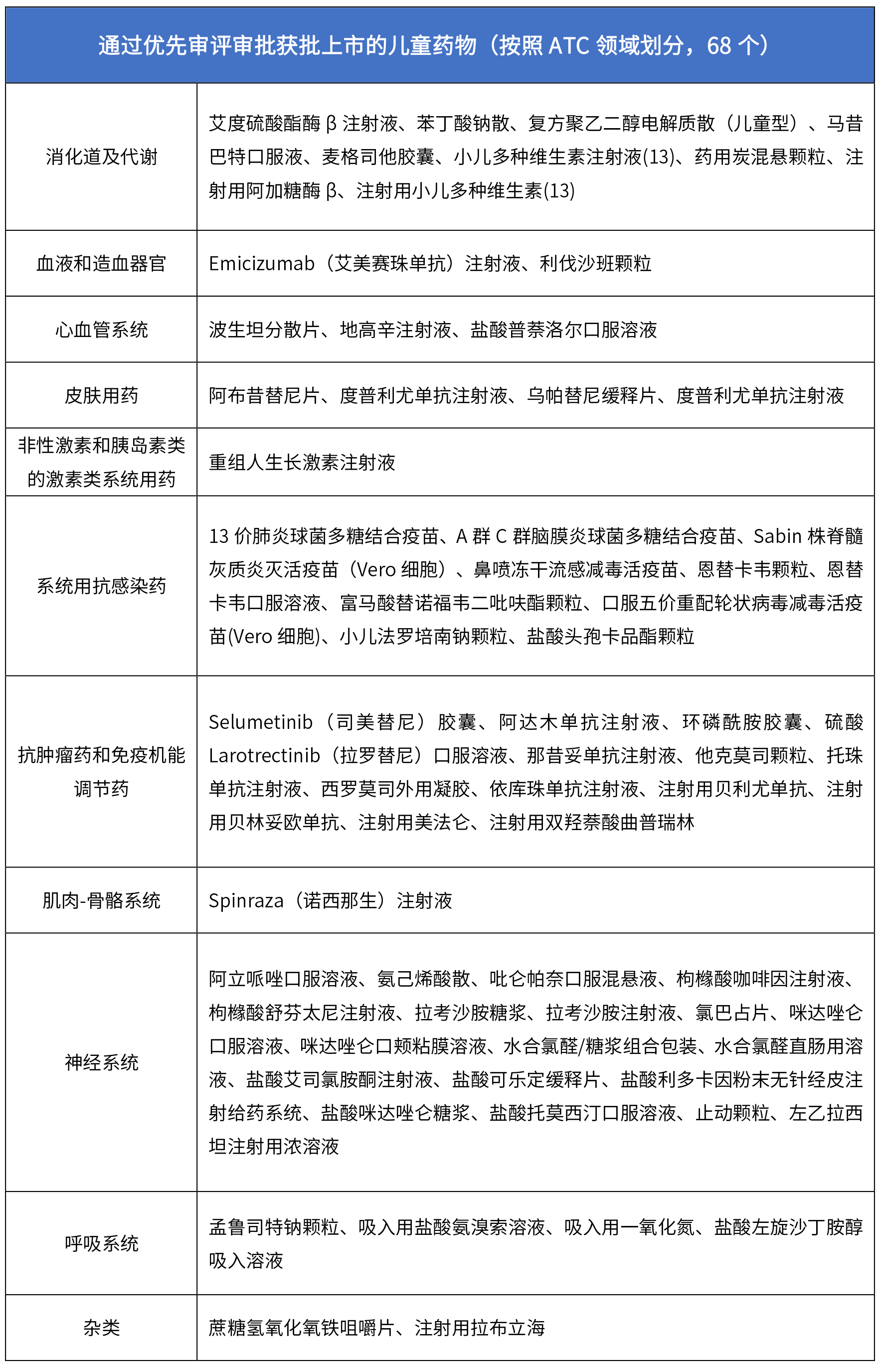 該清單中的藥品涵蓋神經(jīng)、心血管、抗腫瘤、免疫機(jī)能等多個(gè)系統(tǒng)。對(duì)企業(yè)而言將有助于企業(yè)合理調(diào)整生產(chǎn)布局,避免研發(fā)盲目性;對(duì)醫(yī)療機(jī)構(gòu)而言可以有效打破“境外有藥、境內(nèi)無(wú)藥”或“無(wú)藥可用”的困境;對(duì)患兒和其監(jiān)護(hù)人而言增加適宜劑型、規(guī)格能夠使兒童服用藥品更加容易,提升不同年齡階段的依從性或順應(yīng)性。