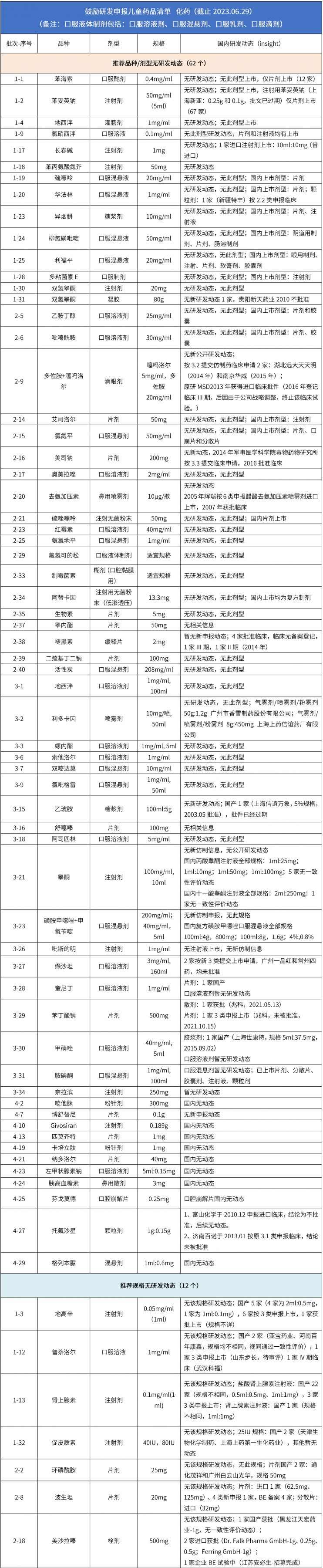 2016-2023年期間衛(wèi)計(jì)委、工信部和食藥監(jiān)局推出4批鼓勵(lì)研發(fā)申報(bào)兒童藥品清單共計(jì)135種,臨床急需兒童藥物共計(jì)11種,清單中的大部分藥物已在國(guó)外上市,但國(guó)內(nèi)缺少該品種或者兒童適宜劑型和規(guī)格,該清單的發(fā)布為我國(guó)兒科用藥發(fā)展指明了方向。
