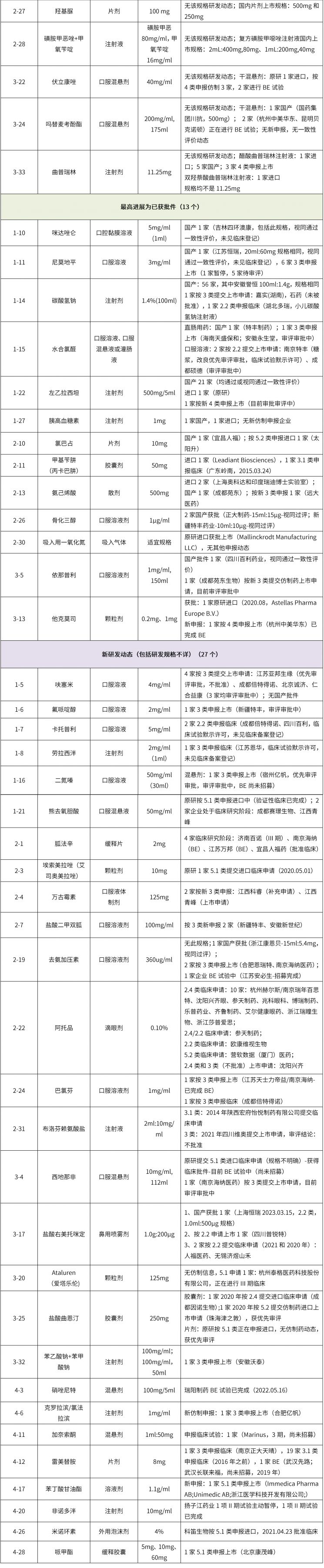 將鼓勵(lì)兒童用藥清單中化藥的國(guó)內(nèi)研發(fā)情況進(jìn)行梳理,其中40個(gè)化藥已有公開研發(fā)動(dòng)態(tài)(35.09%),13個(gè)品種已獲批件(11.40%)、27個(gè)品種處于臨床或申報(bào)階段。企業(yè)研發(fā)熱度較高的品種有碳酸氫鈉注射液、左乙拉西坦注射液、阿托品滴眼液、呋塞米口服溶液、胍法辛緩釋片等。清單中65%以上的化藥(約74個(gè)品規(guī))暫無(wú)企業(yè)申報(bào)或者公開研發(fā)動(dòng)態(tài),對(duì)于擬布局兒童藥物市場(chǎng)的企業(yè),還有很多的選擇空間。
