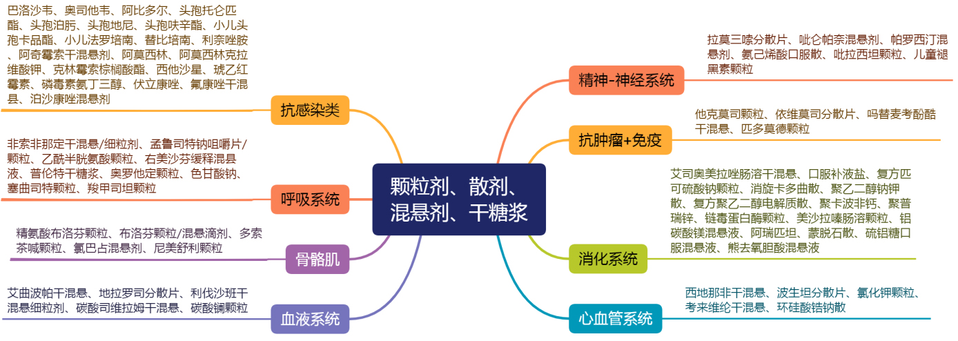 針對(duì)兒童優(yōu)勢(shì)劑型,新領(lǐng)先醫(yī)藥在口服溶液劑、顆粒劑、散劑、混懸劑、干糖漿、口溶膜、口崩片、分散片等劑型方面均有布局,涉及精神-神經(jīng)系統(tǒng)、抗腫瘤-免疫、消化系統(tǒng)、心血管系統(tǒng)、血液系統(tǒng)等多個(gè)領(lǐng)域,助力國(guó)內(nèi)兒童企業(yè)產(chǎn)品開發(fā)及選擇,以下為新領(lǐng)先醫(yī)藥部分研發(fā)產(chǎn)品清單。