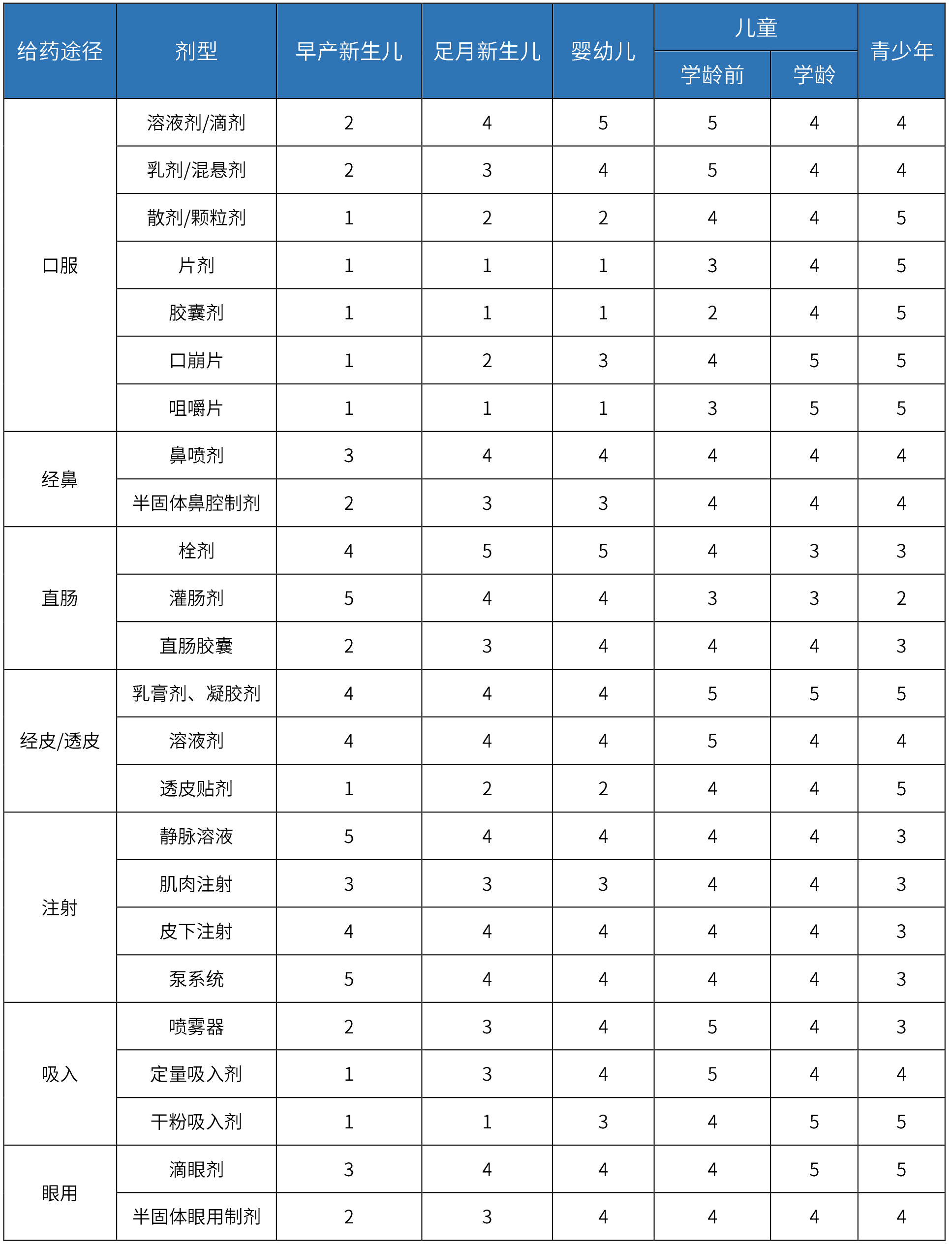 顆粒劑、散劑、口服溶液、口服混懸液、口服滴劑、口服乳劑、細(xì)粒劑、口崩片、口溶膜劑、干混懸劑、咀嚼片、微片、片劑、分散片、膠囊、注射劑等。在2020年發(fā)布的《兒童用藥(化學(xué)藥品)藥學(xué)開發(fā)指導(dǎo)原則(試行)》中,藥審中心列舉了不同年齡段兒童對(duì)于部分給藥途徑和劑型的可接受性調(diào)研結(jié)果。指標(biāo)1~5對(duì)于低齡兒童主要說(shuō)明給藥途徑和劑型的適宜性,數(shù)值越高,適宜性越高;對(duì)于更高年齡的兒童表示對(duì)特定劑型的接受程度,數(shù)值越高,接受程度越高。