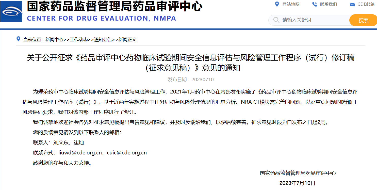 關(guān)于公開征求《藥品審評(píng)中心藥物臨床試驗(yàn)期間安全信息評(píng)估與風(fēng)險(xiǎn)管理工作程序(試行)修訂稿(征求意見稿)》意見的通知