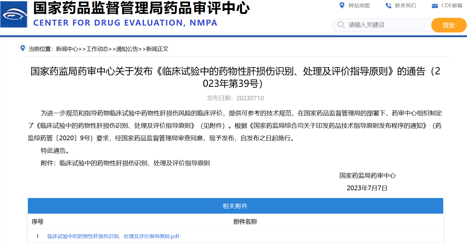 國(guó)家藥監(jiān)局藥審中心關(guān)于發(fā)布《臨床試驗(yàn)中的藥物性肝損傷識(shí)別、處理及評(píng)價(jià)指導(dǎo)原則》的通告(2023年第39號(hào))