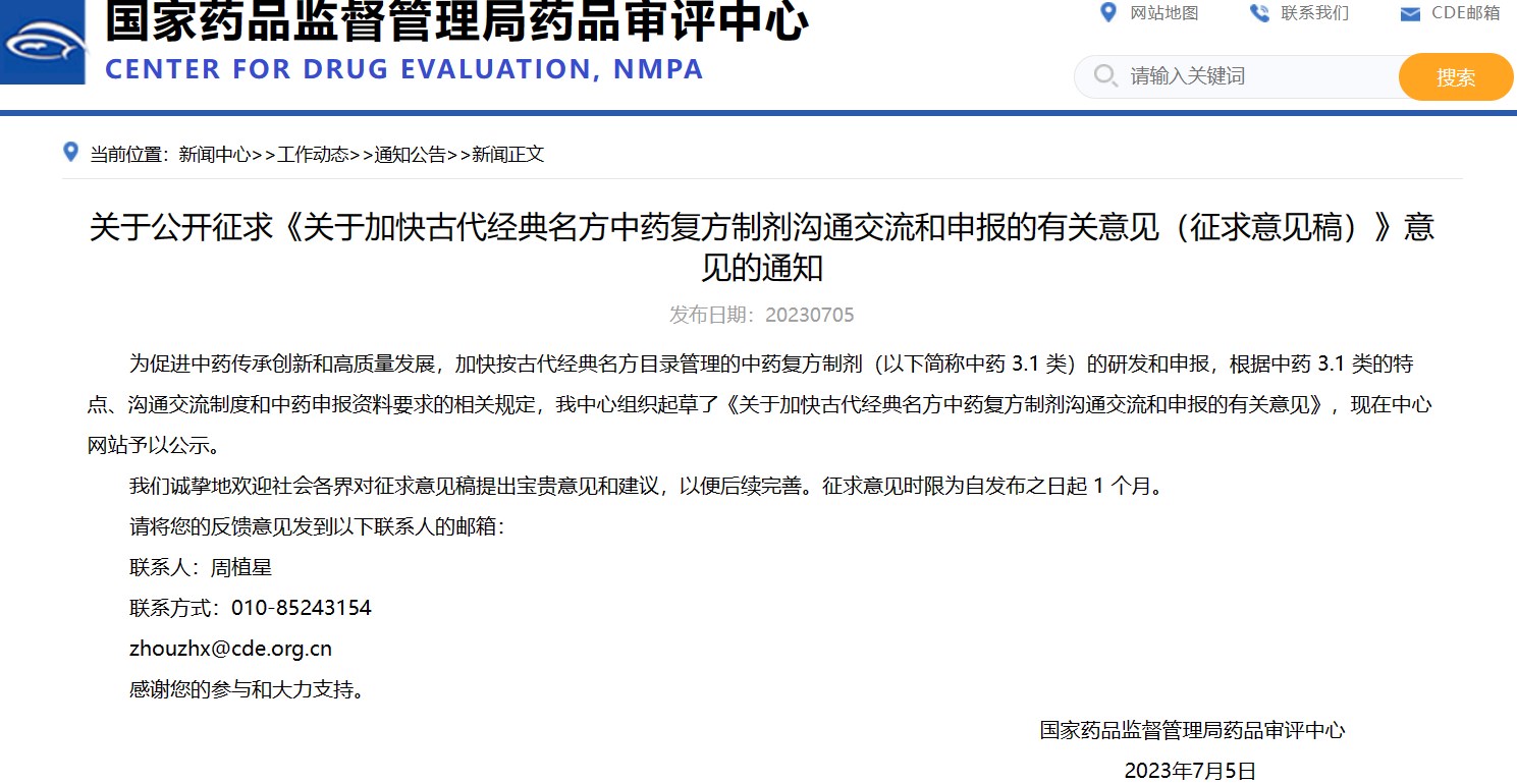 關(guān)于公開征求《關(guān)于加快古代經(jīng)典名方中藥復(fù)方制劑溝通交流和申報(bào)的有關(guān)意見(征求意見稿)》意見的通知