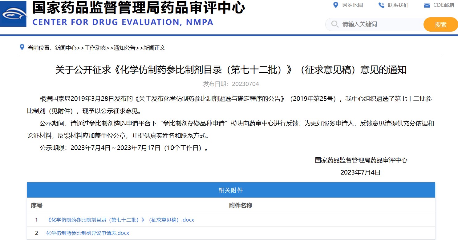關(guān)于公開征求《化學(xué)仿制藥參比制劑目錄(第七十二批)》(征求意見稿)意見的通知