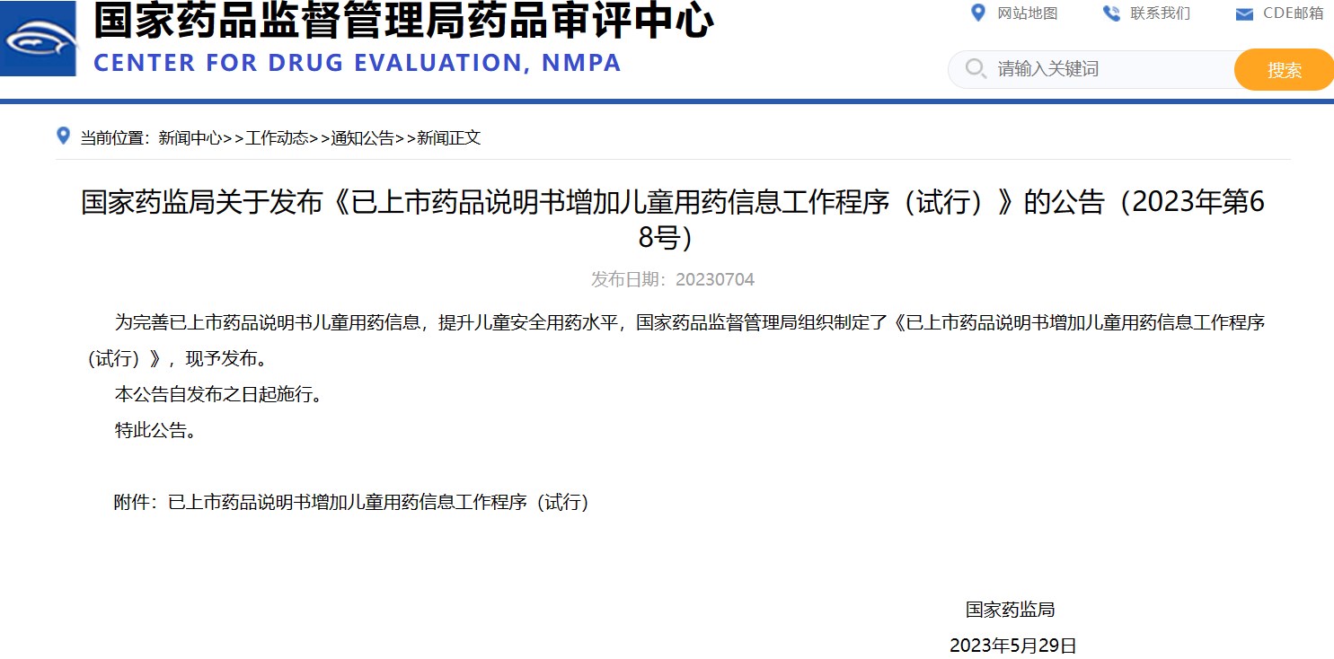 國(guó)家藥監(jiān)局關(guān)于發(fā)布《已上市藥品說(shuō)明書增加兒童用藥信息工作程序(試行)》的公告(2023年第68號(hào))