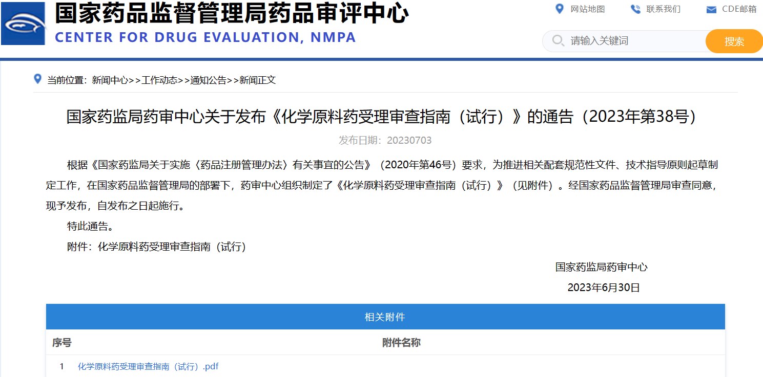 國(guó)家藥監(jiān)局藥審中心關(guān)于發(fā)布《化學(xué)原料藥受理審查指南(試行)》的通告(2023年第38號(hào))