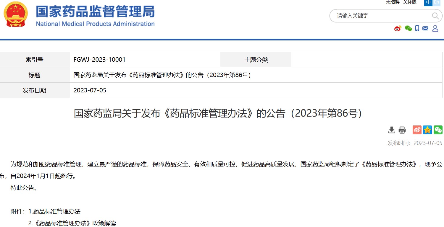 國(guó)家藥監(jiān)局關(guān)于發(fā)布《藥品標(biāo)準(zhǔn)管理辦法》的公告(2023年第86號(hào))