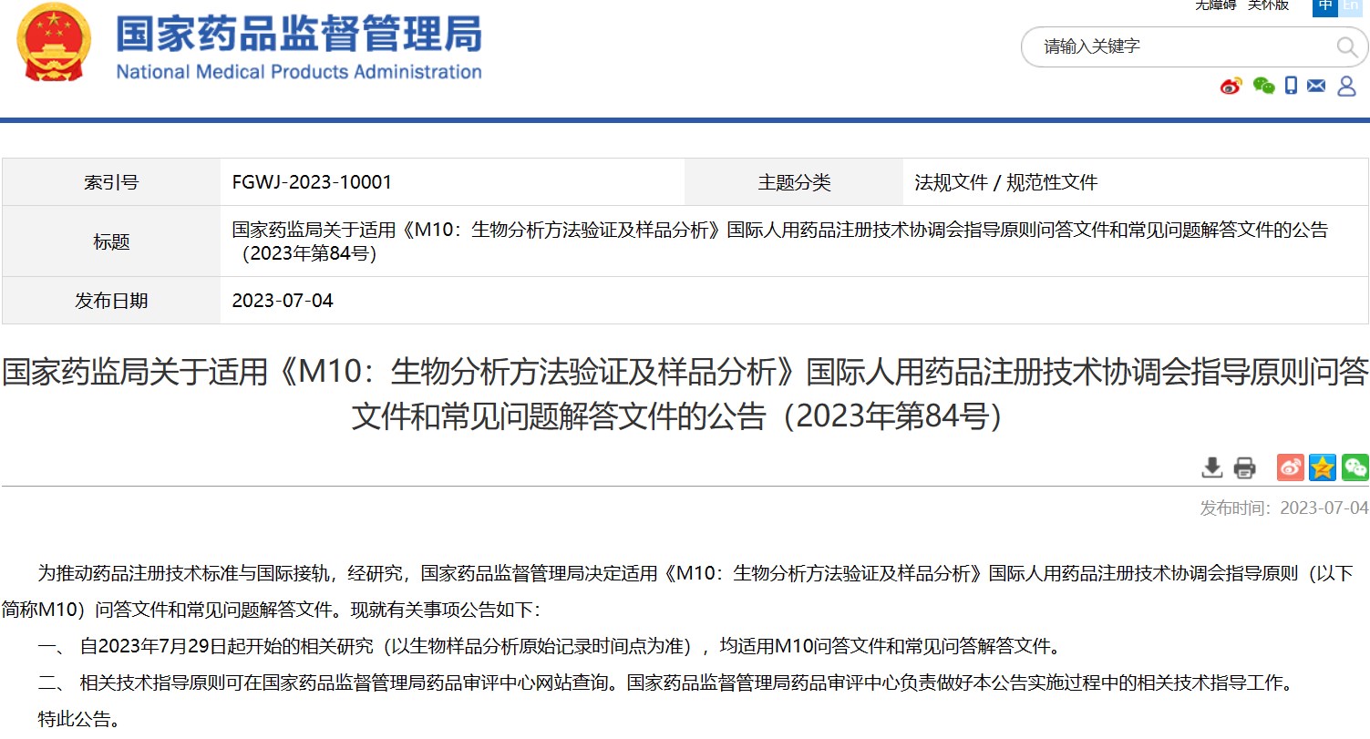 國(guó)家藥監(jiān)局關(guān)于適用《M10:生物分析方法驗(yàn)證及樣品分析》國(guó)際人用藥品注冊(cè)技術(shù)協(xié)調(diào)會(huì)指導(dǎo)原則問(wèn)答文件和常見問(wèn)題解答文件的公告(2023年第84號(hào))