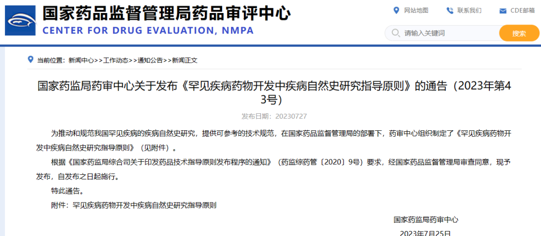 國家藥監(jiān)局藥審中心關(guān)于發(fā)布《罕見疾病藥物開發(fā)中疾病自然史研究指導(dǎo)原則》的通告(2023年第43號)
