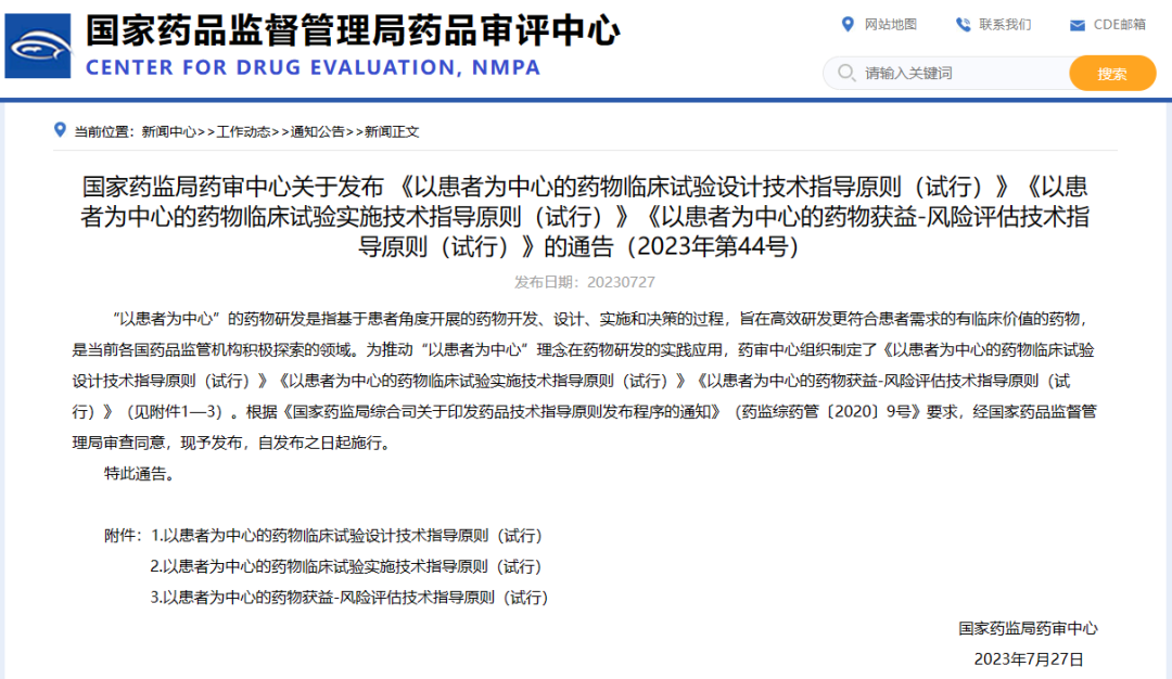國家藥監(jiān)局藥審中心關(guān)于發(fā)布 《以患者為中心的藥物臨床試驗設(shè)計技術(shù)指導(dǎo)原則(試行)》《以患者為中心的藥物臨床試驗實施技術(shù)指導(dǎo)原則(試行)》《以患者為中心的藥物獲益-風(fēng)險評估技術(shù)指導(dǎo)原則(試行)》的通告(2023年第44號)