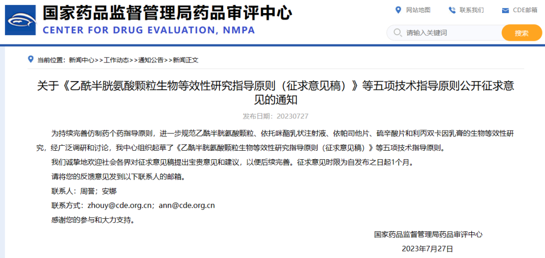 關(guān)于《乙酰半胱氨酸顆粒生物等效性研究指導(dǎo)原則(征求意見稿)》等五項技術(shù)指導(dǎo)原則公開征求意見的通知