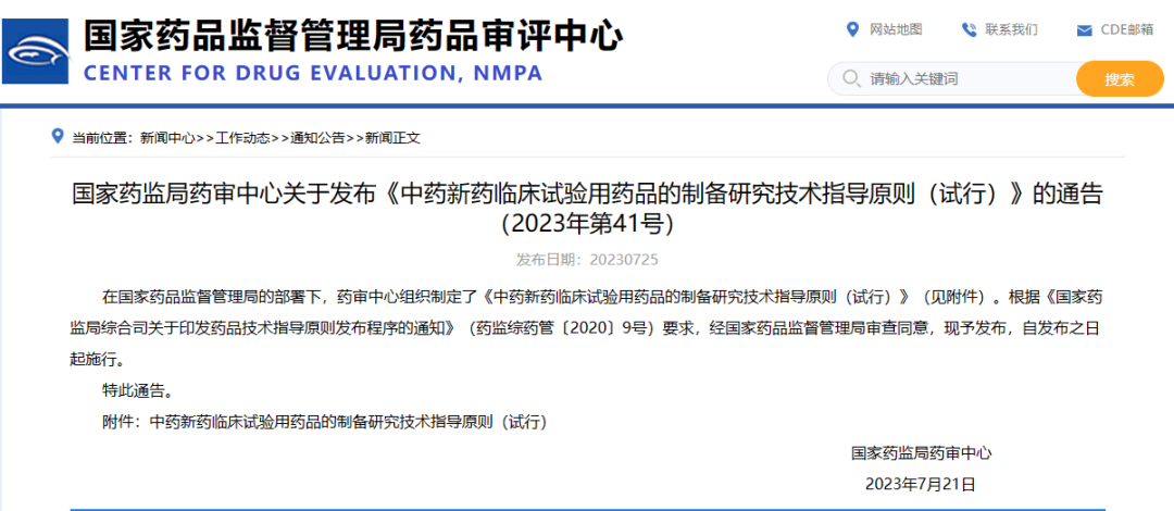 國家藥監(jiān)局藥審中心關(guān)于發(fā)布《中藥新藥臨床試驗用藥品的制備研究技術(shù)指導(dǎo)原則(試行)》的通告(2023年第41號)