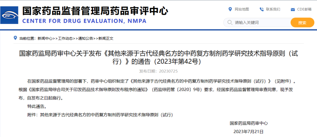 國家藥監(jiān)局藥審中心關(guān)于發(fā)布《其他來源于古代經(jīng)典名方的中藥復(fù)方制劑藥學(xué)研究技術(shù)指導(dǎo)原則(試行)》的通告(2023年第42號)